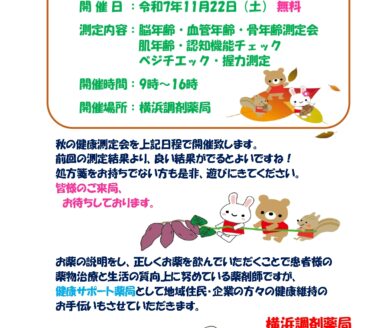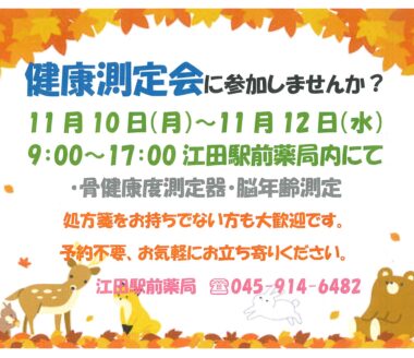 こんにちは。江田駅前薬局です。 令和7年11月10日(月)~12日(水)江田駅前薬局内にて健康測定