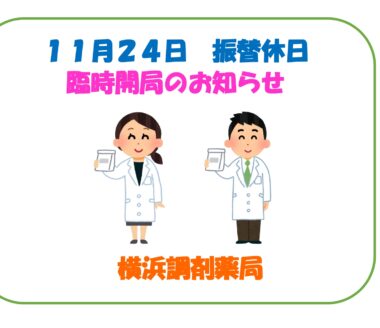 薬局臨時開局のお知らせ 令和7年11月24日(月) 9時~17時 緊急体制(薬剤師2名・事務1名)で