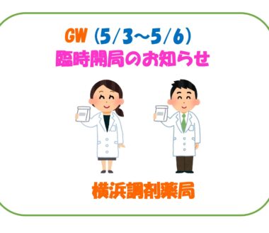 GW薬局臨時開局のお知らせ 令和8年5月3日(日)~5月6日(水) 10時~17時 緊急体制(薬剤師