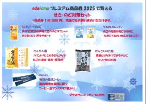 当薬局でもプレミアム商品券1枚(500円分)または現金500円で買えるedatomoセットをご用意しました。