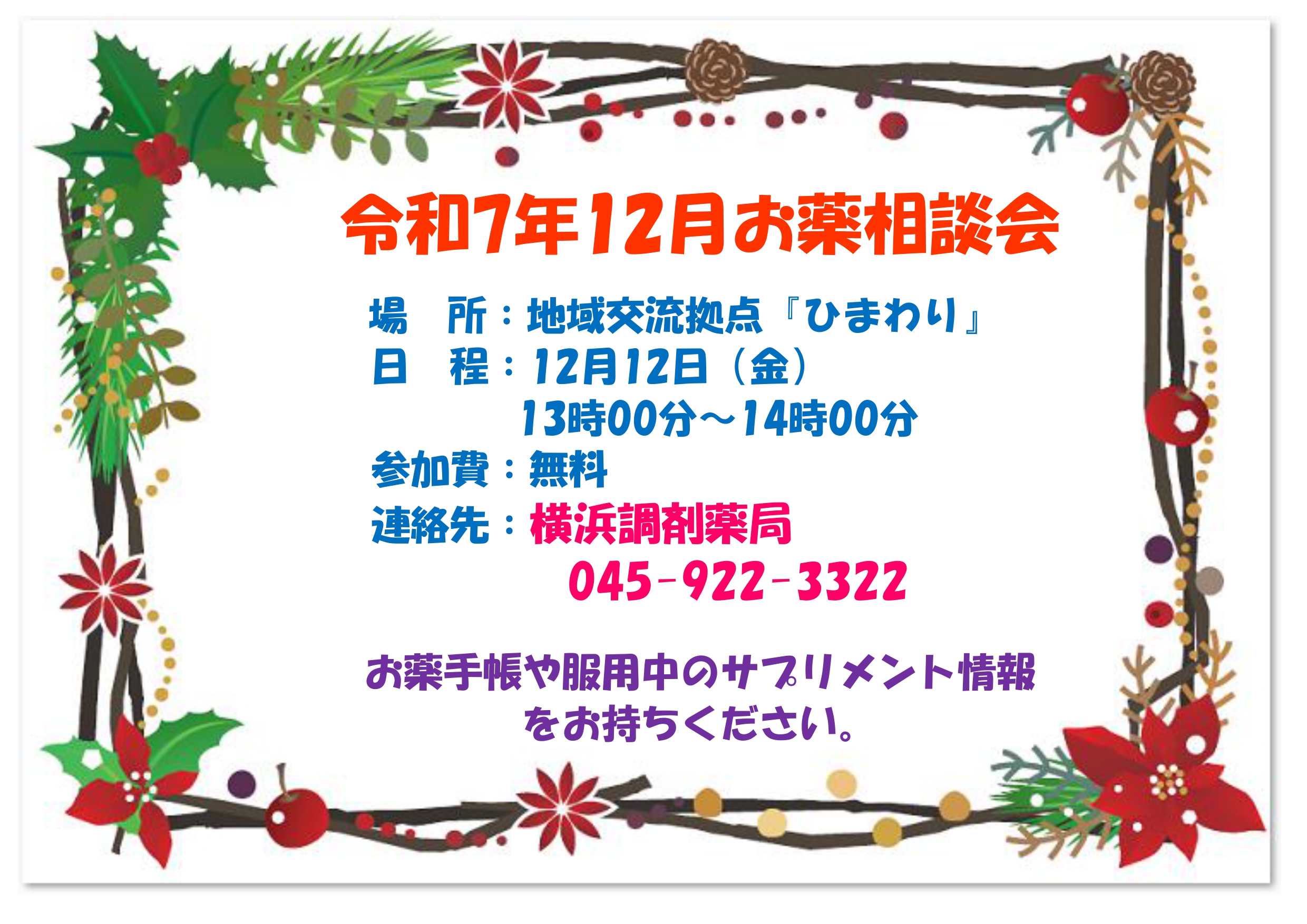 info 令和7年12月12日(金)お薬相談会を開催しました🌻 横浜調剤薬局 2025.12.17 お知らせ Home > お知らせ > 横浜調剤薬局 > 令和7年12月12日(金)お薬相談会を開催しました🌻 令和7年12月12日(金)地域交流拠点ひまわり🌻にてお薬相談会を開催致しました。 今回は福留薬剤師より、『お薬・健康の総まとめ』をさせていただきました。 *薬局での手続きとマイナ保険証 *薬の作用と体内での流れ *薬の服用に関するQ&A *健康維持のための生活習慣 等々 1年の総まとめ、いかがでしたか? 来年第一弾のお薬相談会は1月16日(金)になります。 多数のご参加お待ちしております。 横浜調剤薬局 << 前の記事へ 記事の一覧へ 次の記事へ >>