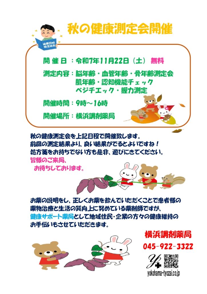 横浜調剤薬局、恒例の「秋の健康測定会」を11月22日(土)を開催いたします!