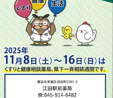 おはようございます。江田駅前薬局です。 11月8日(土)~16日(日) はくすりと健康相談薬局、県