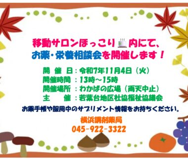 令和7年11月4日(火)若葉台地区社会福祉協議会による移動サロン『ほっこり』内にて13時~15時、ふ